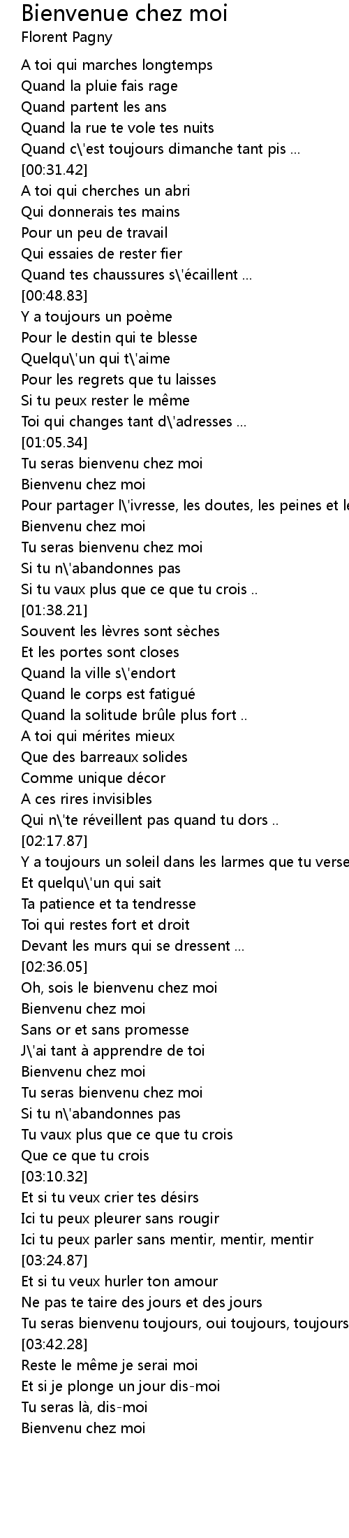 | [02:57.73] | Tu seras bienvenu chez moi |