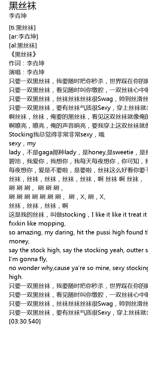 | [03:18.570] | 只要一双黑丝袜,要有丝袜气质很Sexy,穿上丝袜就会很amazing,看到丝袜把我秒啦。 |