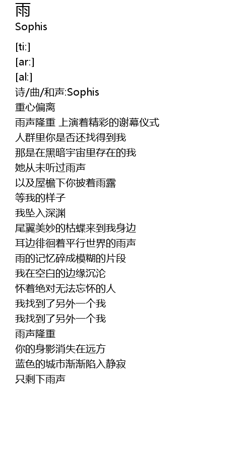 | [00:02.54] | 诗/曲/和声:Sophis |