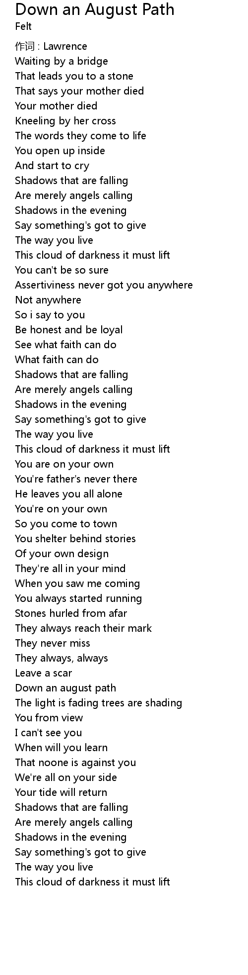 | Song | Down an August Path |