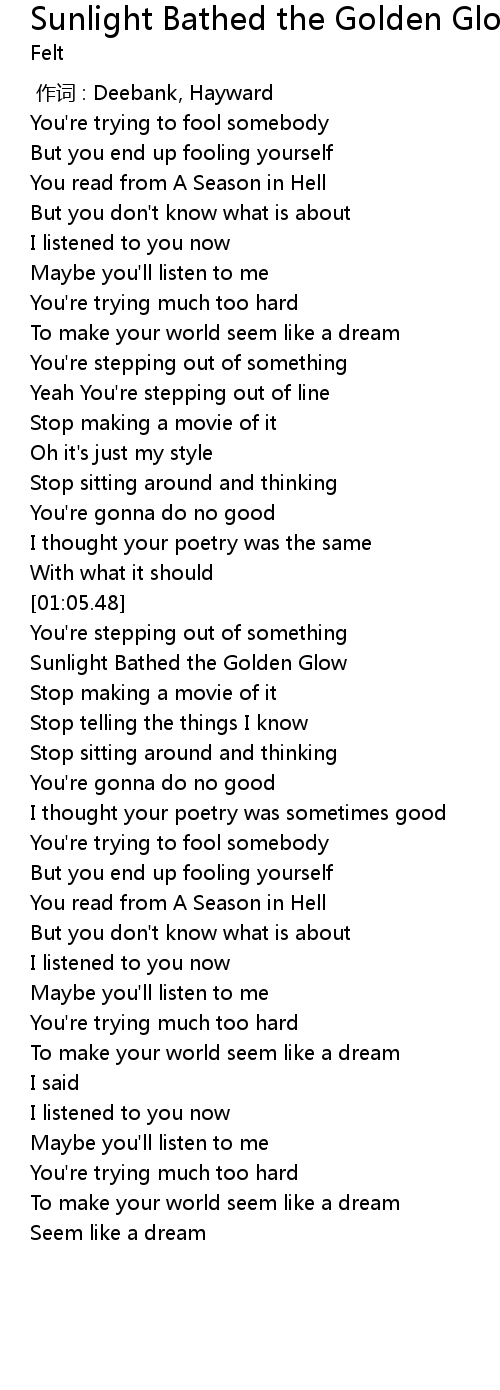 | [01:33.43] | Sunlight Bathed the Golden Glow |