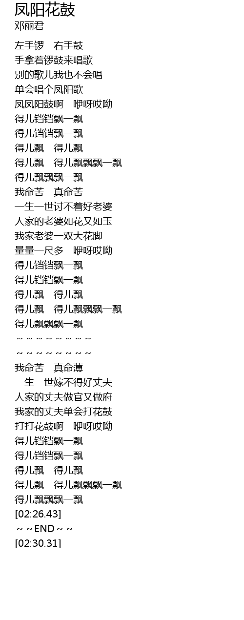 | [00:32.77] | 凤凤阳鼓啊 咿呀哎呦 |