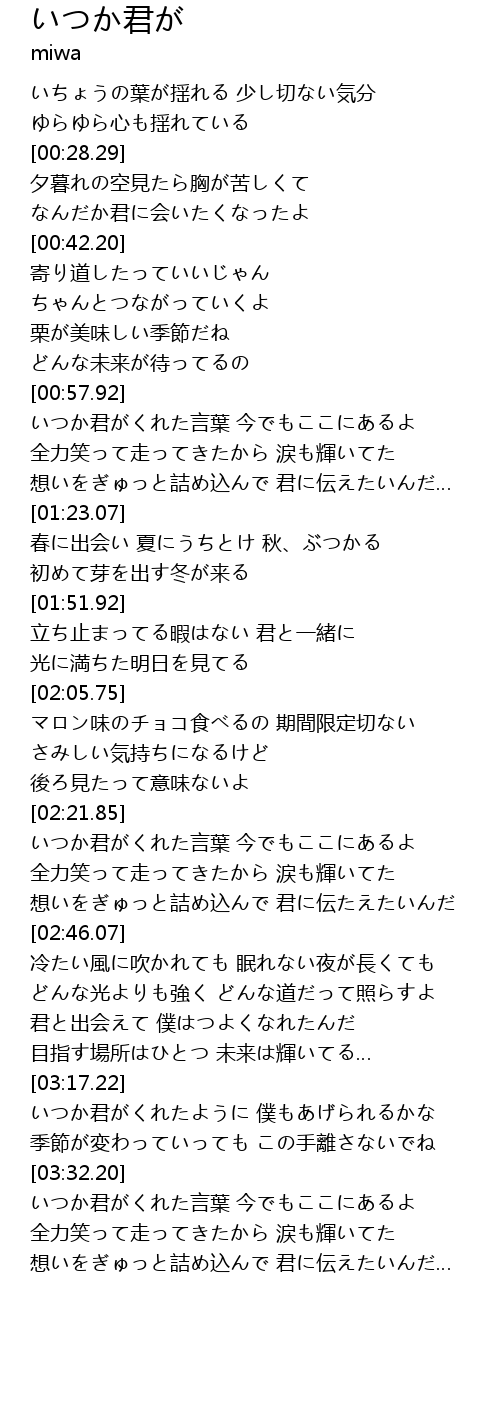 | [03:33.71] | いつか君がくれた言葉 今でもここにあるよ |
