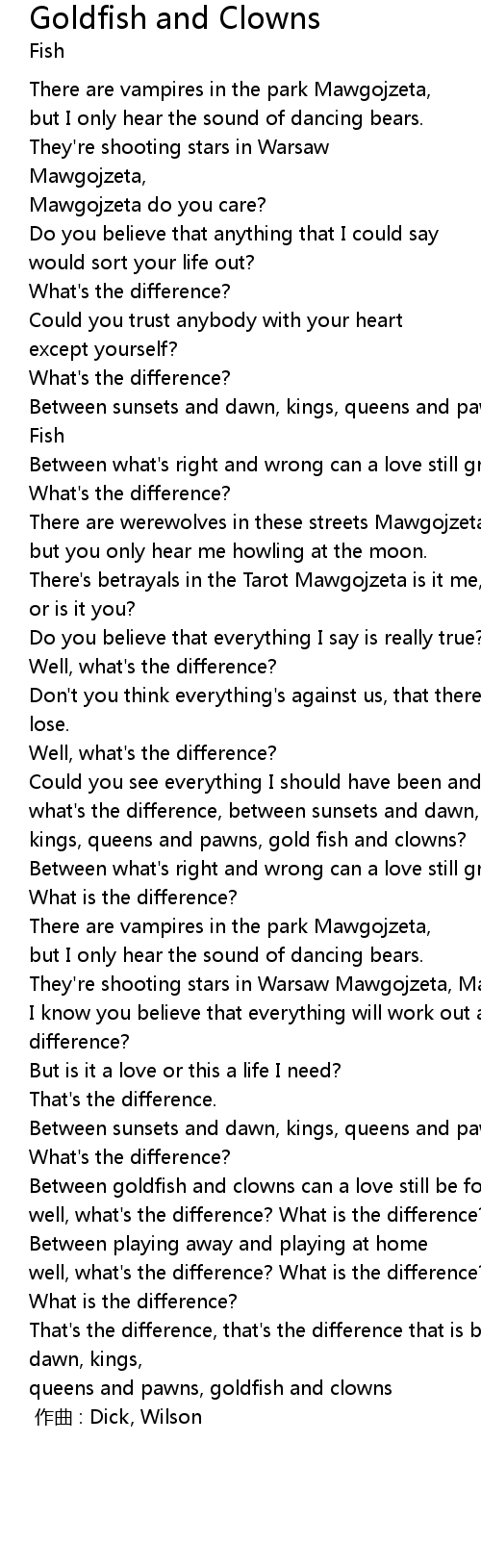 | Between sunsets and dawn, kings, queens and pawns, goldfish and clowns. | |