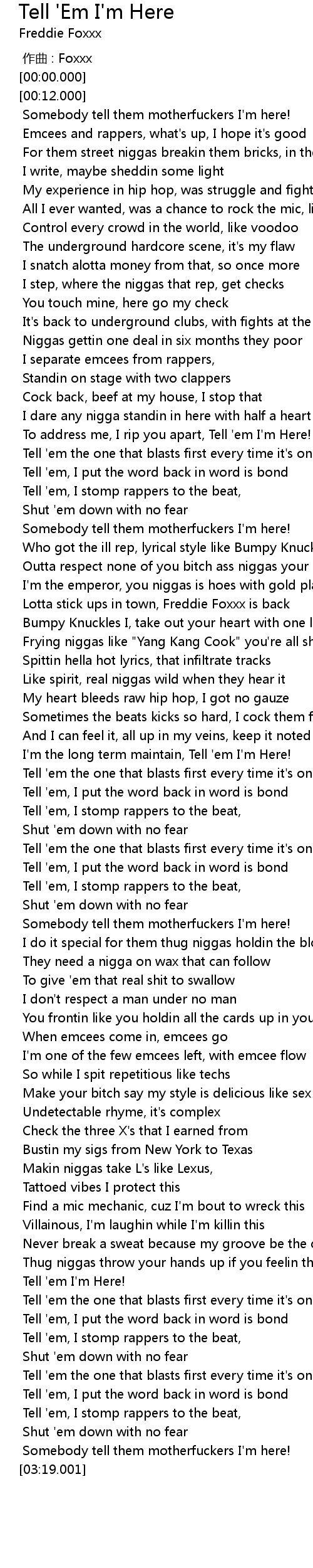 | [00:14.381] | Somebody tell them motherfuckers I' m here! |
