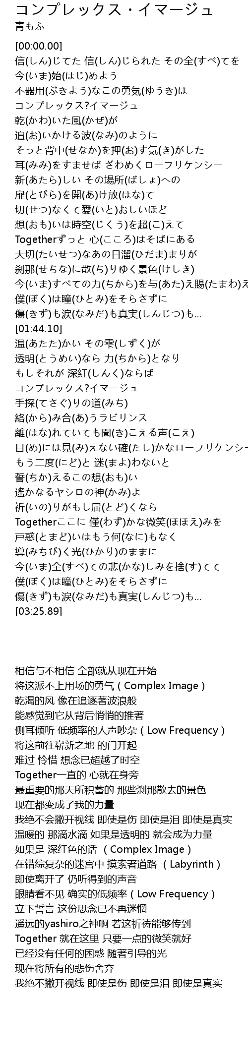 | [00:26.47] | 不器用(ぶきよう)なこの勇気(ゆうき)は コンプレックス?イマージュ |