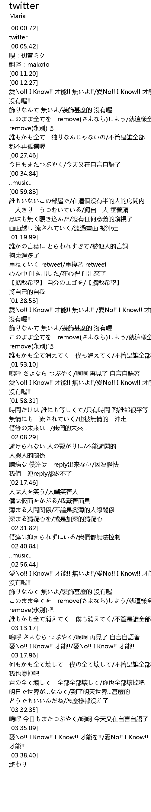 | [00:17.82] | このまま全てを remove(さよなら)しよう/就這樣全部 remove(永別)吧 |