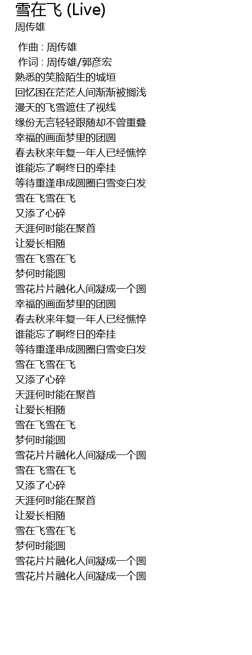 | [03:15.17] | 雪花片片融化人间凝成一个圆 |