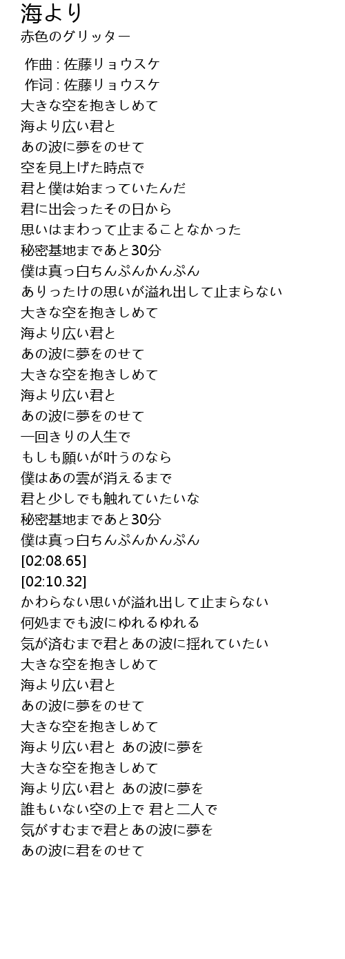 | [02:49.32] | 海より広い君と |