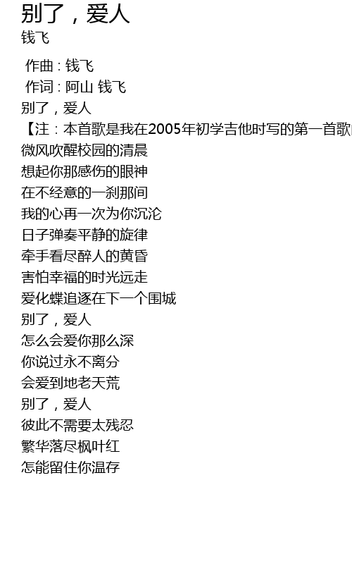 | [00:01.04] | 【注:本首歌是我在2005年初学吉他时写的第一首歌曲,由于当时手机配置原因,仅能录制一分钟的视频,故现仅存转录的副歌部分录音】 |