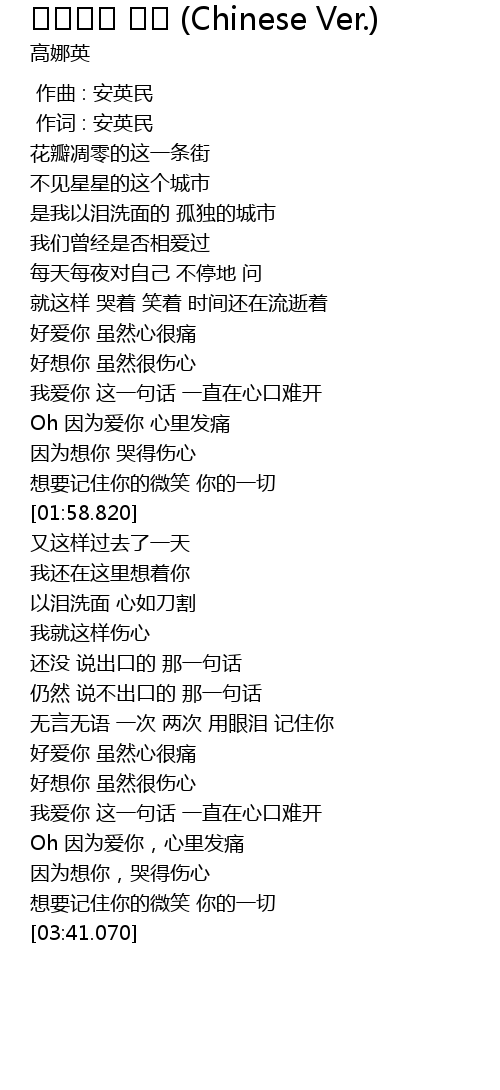 | [03:13.480] | Oh yīn wèi ài nǐ, xīn lǐ fā tòng |