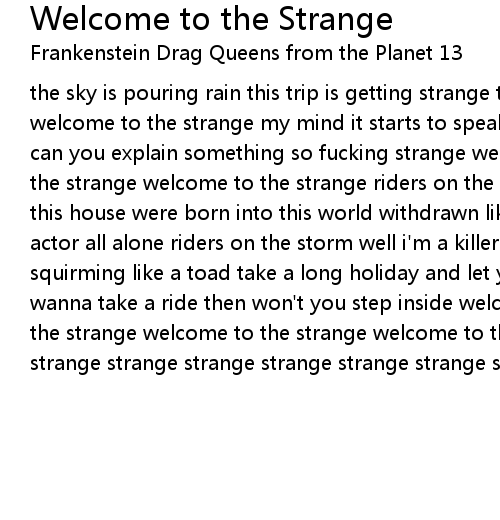 the sky is pouring rain this trip is getting strange the sign up ahead says welcome to the strange my mind it starts to speak but it won't speak to me how can you explain something so fucking strange welcome to the strange welcome to the strange welcome to the strange riders on the storm riders on the storm into this house were born into this world withdrawn like a dog without a bone an actor all alone riders on the storm well i'm a killer on the road my brain is squirming like a toad take a long holiday and let your children play if you wanna take a ride then won't you step inside welcome to the strange welcome to the strange welcome to the strange welcome to the strange welcome to the strange strange strange strange strange strange strange strange |