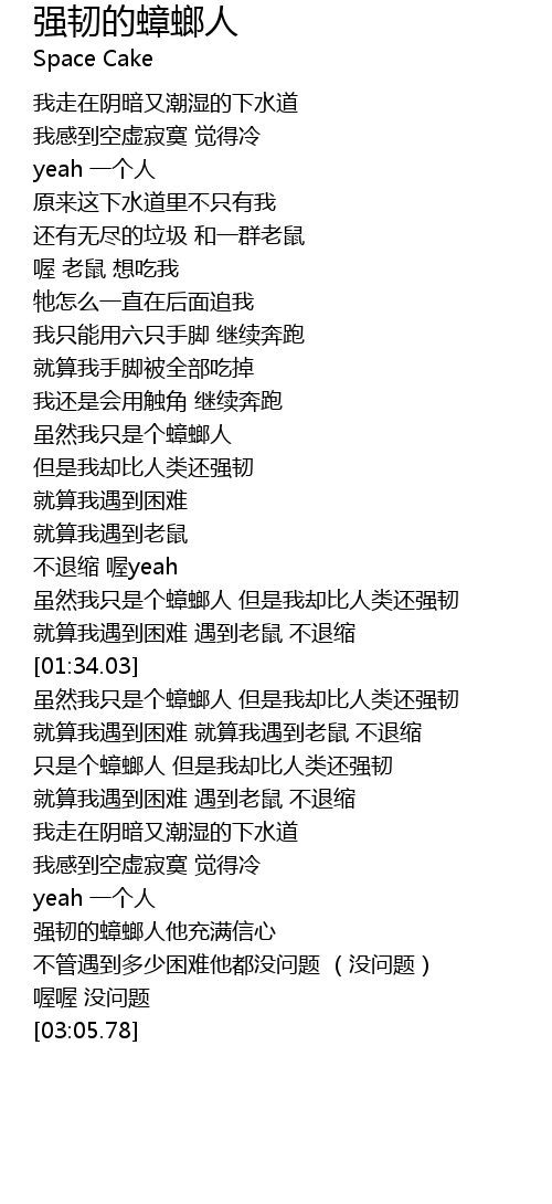 | [02:07.23] | 虽然我只是个蟑螂人 但是我却比人类还强韧 |