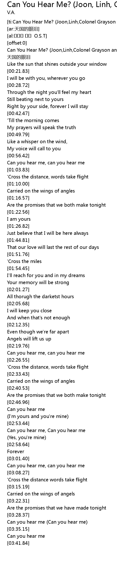 | [00:00.72] | Can You Hear Me? (Joon,Linh,Colonel Grayson and Company) - 天国的眼泪 |