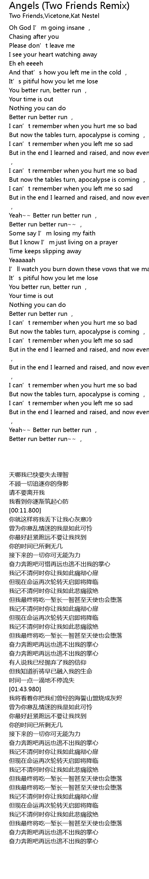 | [00:43.340] | But in the end I learned and raised, and now even Angels could be bad , |