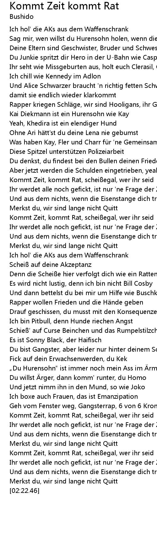 | [02:01.62] | Kommt Zeit, kommt Rat, scheißegal, wer ihr seid |