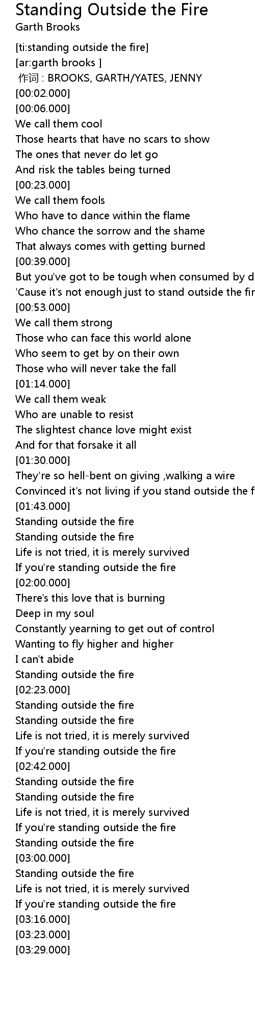 | [00:46.000] | 'Cause it's not enough just to stand outside the fire |