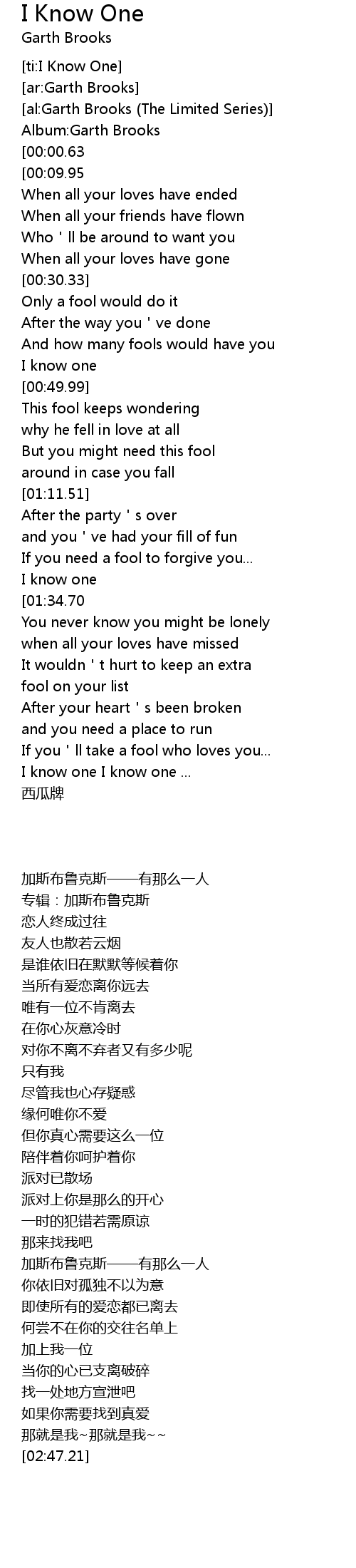| [01:47.36][00:00.63] | Garth BrooksI Know One |