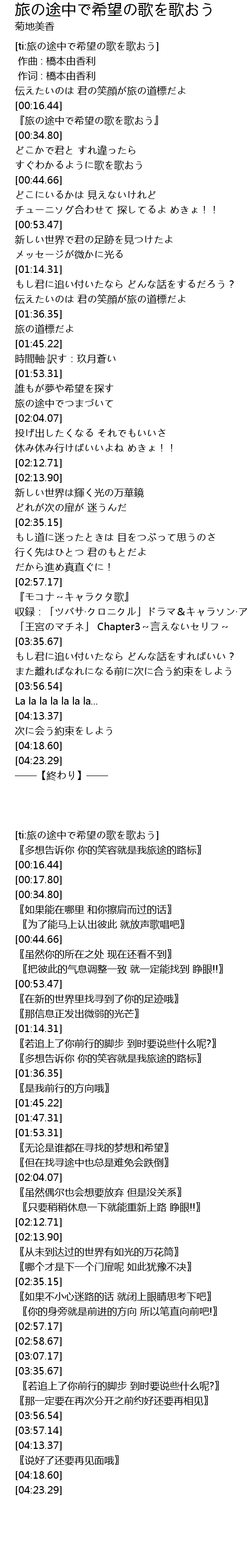 | [00:17.80] | 『旅の途中で希望の歌を歌おう』 |