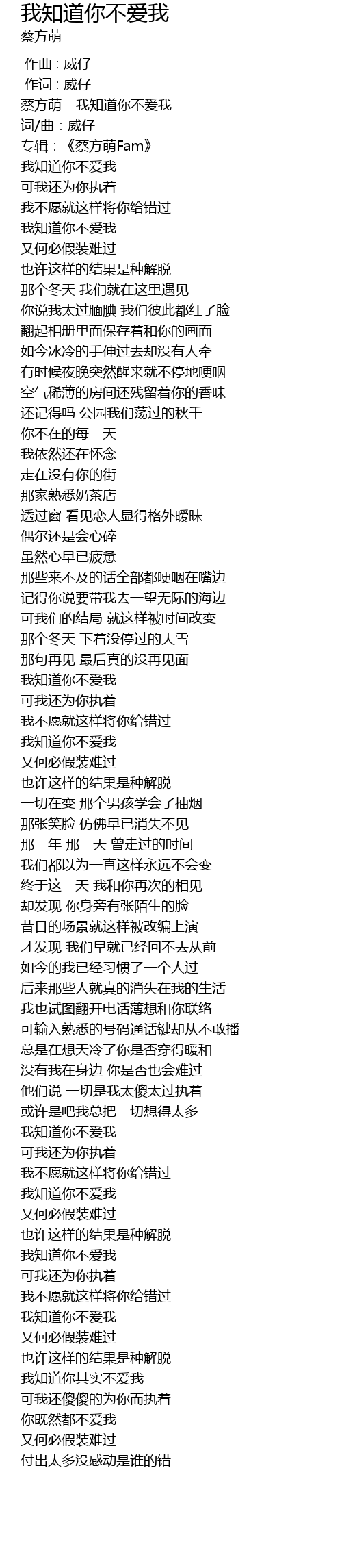 | [00:00.000] | 蔡方萌 - 我知道你不爱我 |