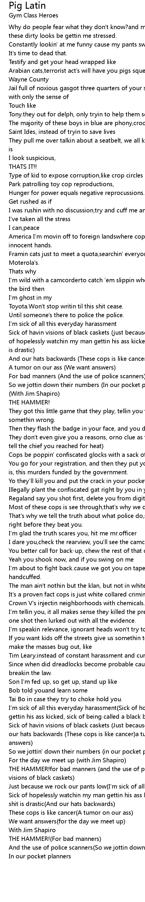 Sick of havin visions of black caskets (Just because we rock our pants low)and our hats backwards (These cops is like cancer)a tumor on our ass, (we want answers) |