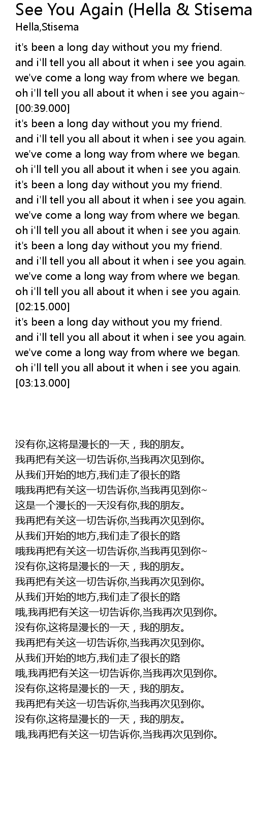 | [00:33.000] | oh i'll tell you all about it when i see you again~ |