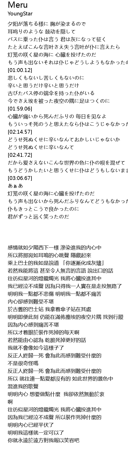| [02:29.55] | どうせ死ぬくせに辛いなんておかしいじゃないか |