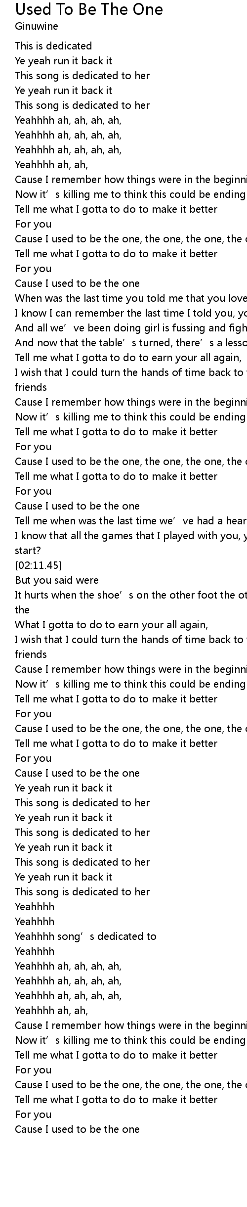 | [01:45.82] | Cause I used to be the one, the one, the one, the one |