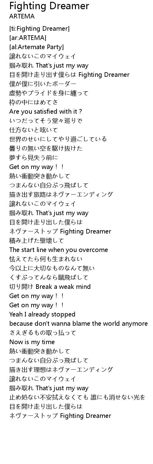 | [00:15.79] | 目を開け走り出す僕らは Fighting Dreamer |