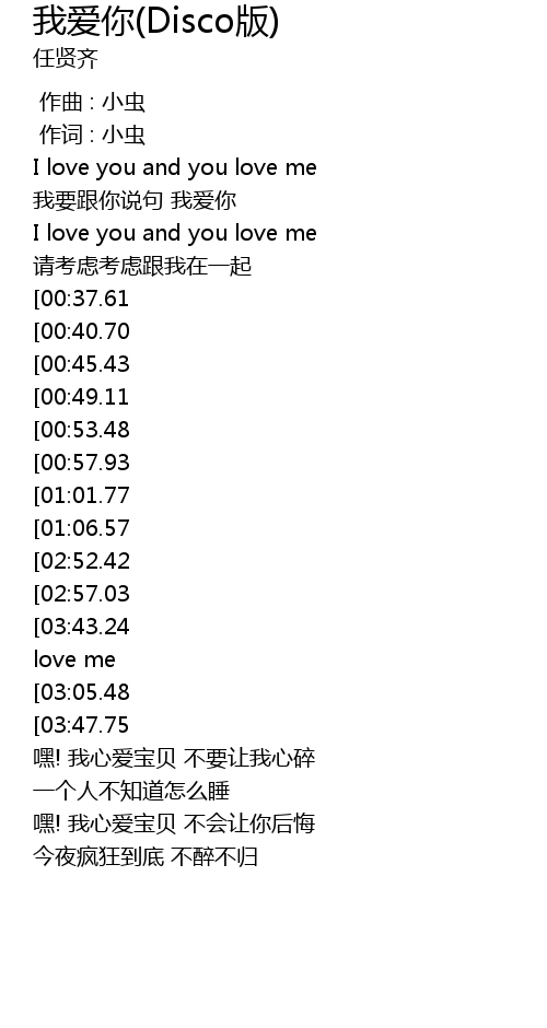 | [03:09.38][02:52.42][01:27.92][01:10.88] | I love you and you love me |