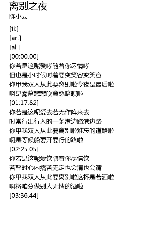 | [00:48.62] | 你甲我双人从此要离别啦今夜是最后啦 |