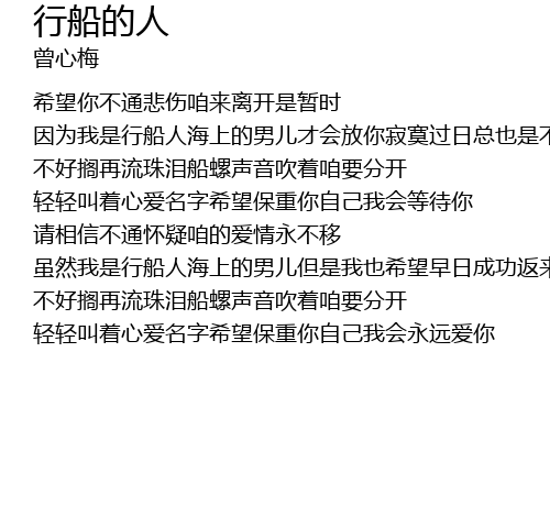 | 因为我是行船人海上的男儿才会放你寂寞过日总也是不得已 | |