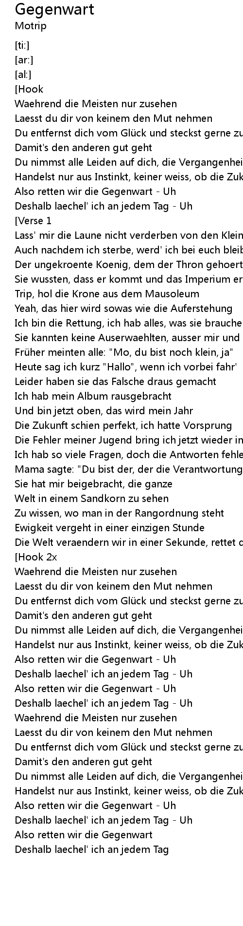 | [00:38.52] | Handelst nur aus Instinkt, keiner weiss, ob die Zukunft was bringt |