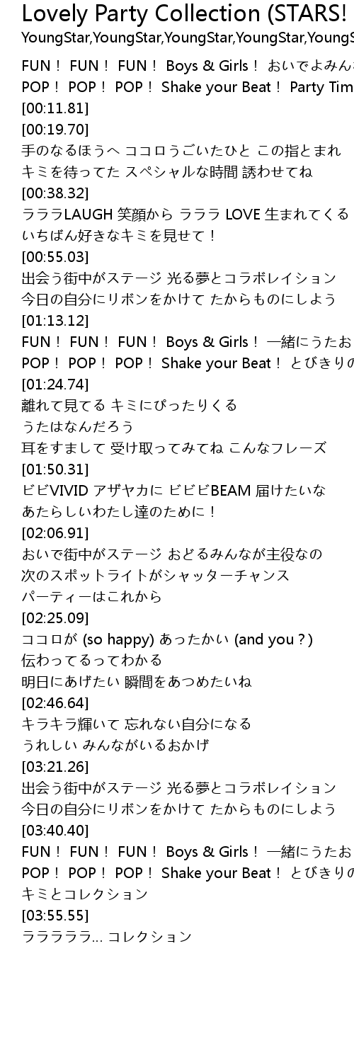 | [00:06.09] | POP! POP! POP! Shake your Beat! Party Time はじまるよ! |