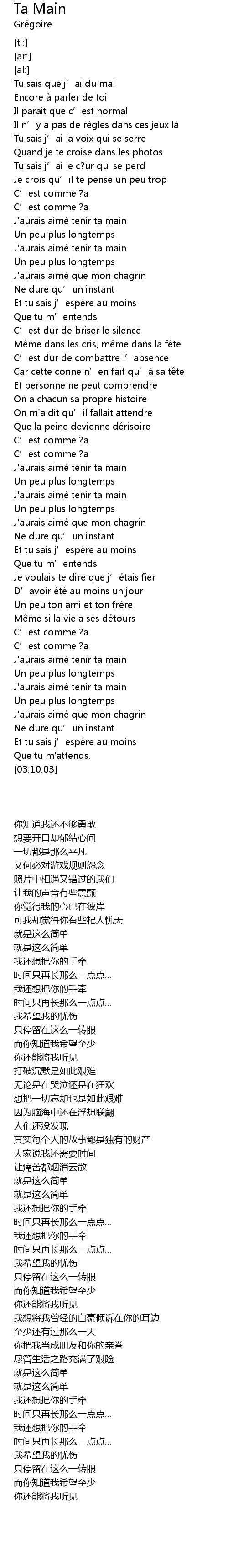 | [02:49.20] | J' aurais aimé tenir ta main |