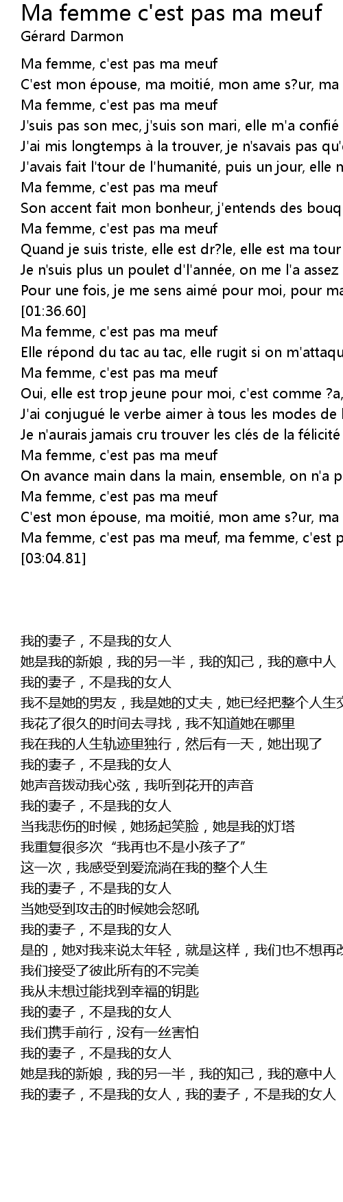 | [00:53.30] | Ma femme, c' est pas ma meuf |