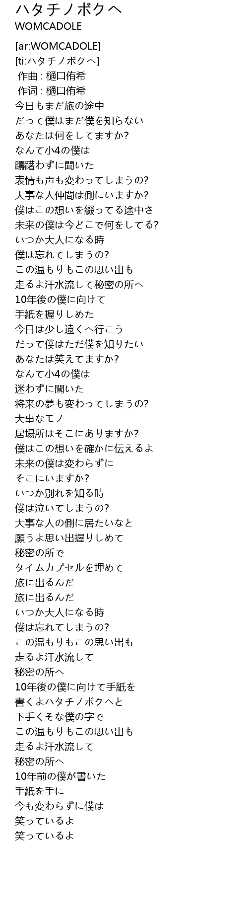 | [04:04.95] | 書くよハタチノボクヘと |