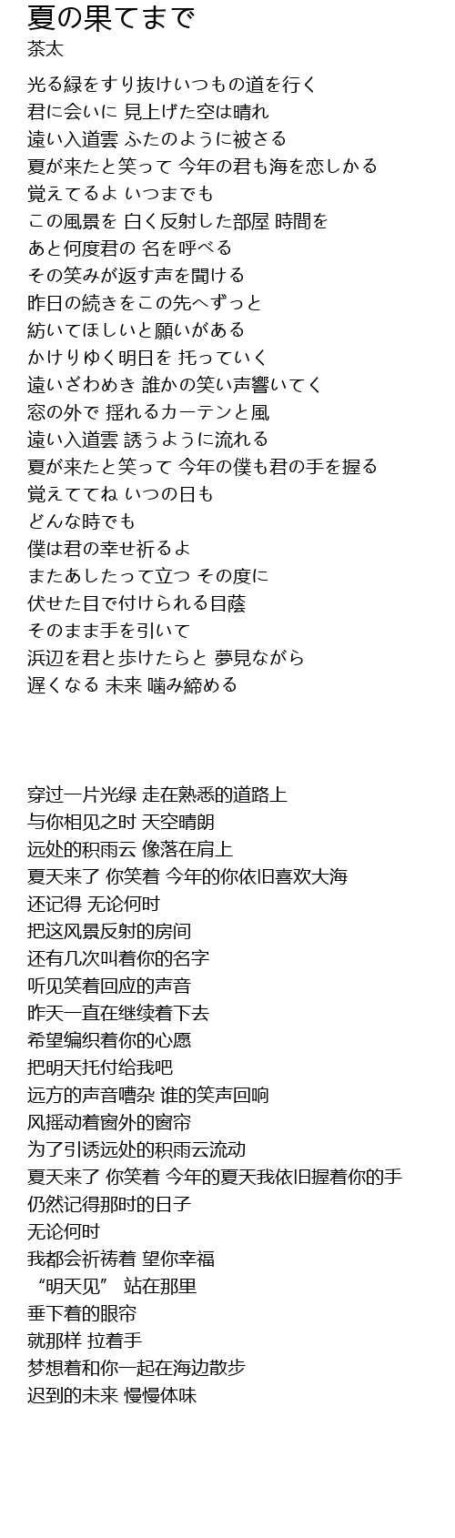 | [04:13.90] | 夏が来たと笑って 今年の僕も君の手を握る |