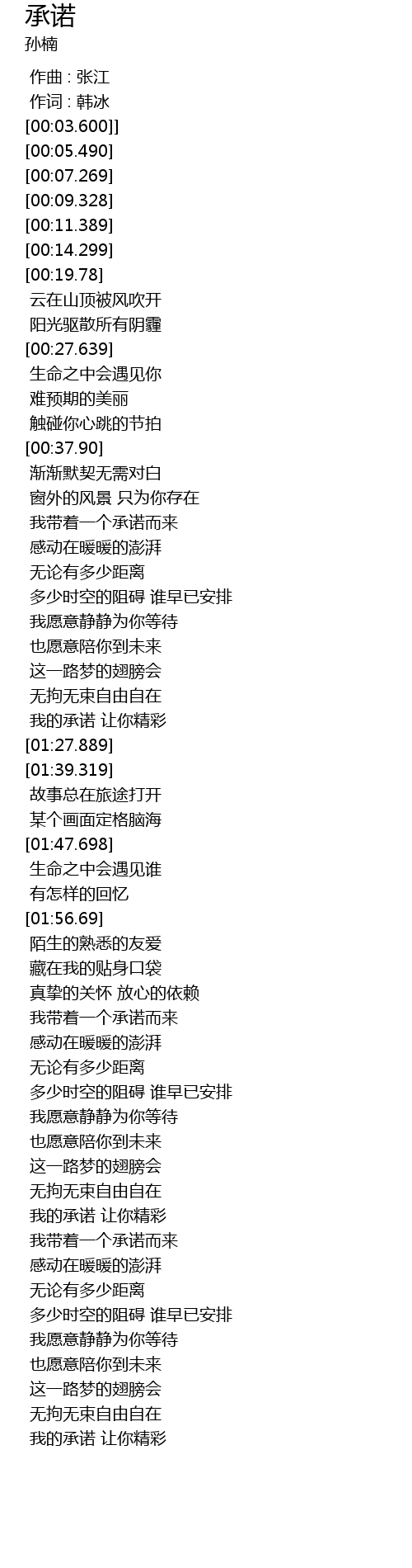 | [02:11.688] | wǒ dài zhe yí gè chéng nuò ér lái |