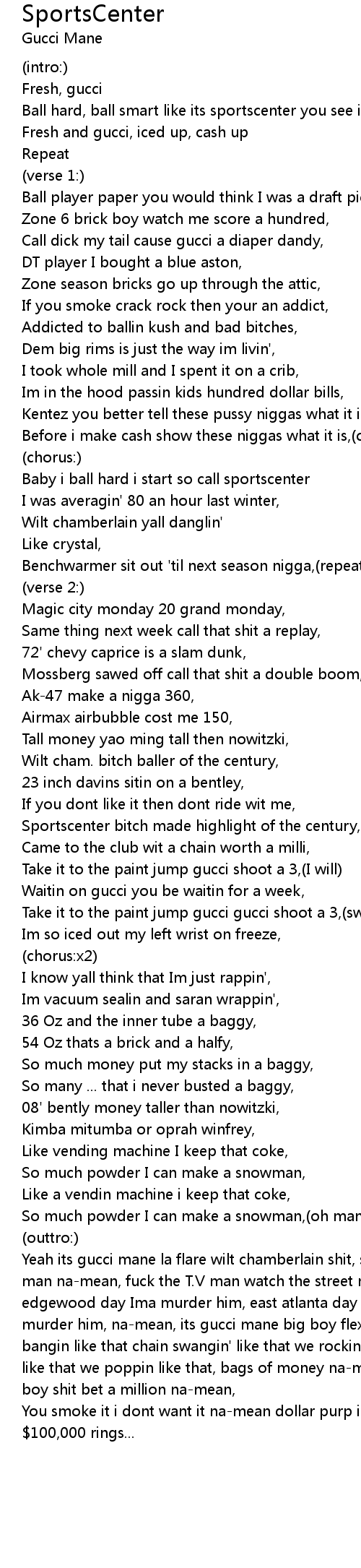 Yeah its gucci mane la flare wilt chamberlain shit, sportscenter, you tuned in man na-mean, fuck the T.V man watch the street man, glenwood day Ima murder him, edgewood day Ima murder him, east atlanta day Ima murder him, swat day Ima murder him, na-mean, its gucci mane big boy flexin so icy entertainment, we bangin like that chain swangin' like that we rockin like that cut off stockin like that we poppin like that, bags of money na-mean never 100's na-mean, big boy shit bet a million na-mean, |