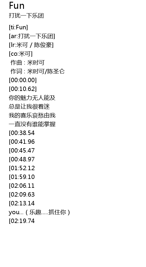 | [02:55.13][02:13.14][01:13.32] | Fun Fun Fun Fun Fun Fun chasing you... le qu..... zhua zhu ni |