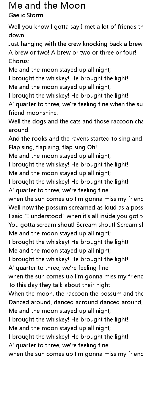 A' quarter to three, we're feeling fine when the sun comes up I'm gonna miss my friend moonshine. |