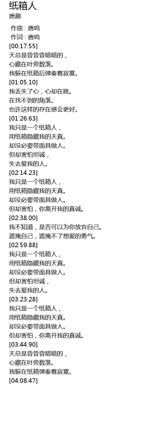 | [03:04.20] | 用纸箱隐藏我的天真。 |