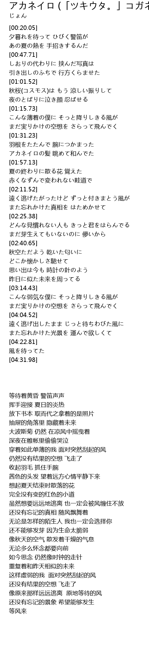 | [02:04.93] | 赤くなずんで変われない畦道で |