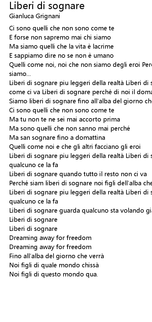 | Liberi di sognare piu leggeri della realta Liberi di sognare per poter vivere come ci va Liberi di sognare perche di noi il domani che ne va | |