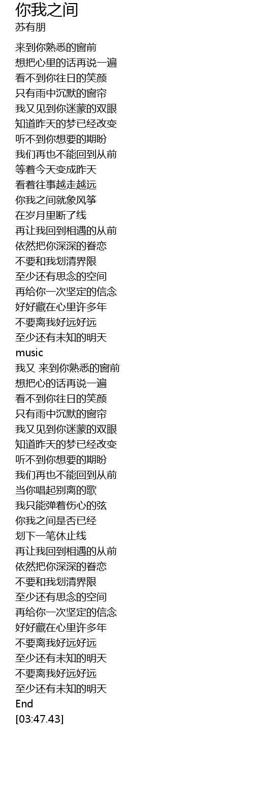 | [02:15.47] | 我又 来到你熟悉的窗前 |