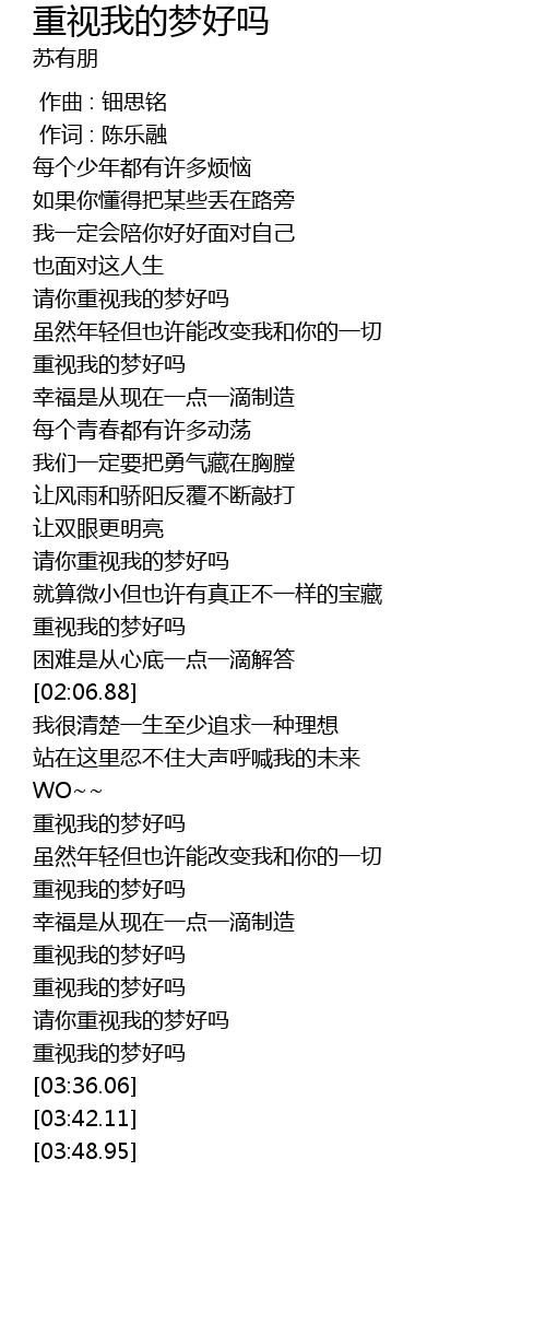 | [03:23.50] | qǐng nǐ zhòng shì wǒ de mèng hǎo ma |
