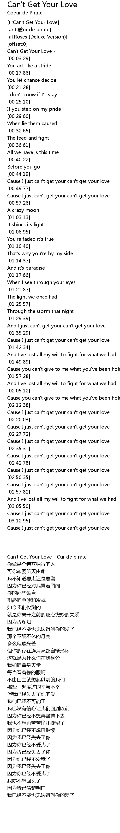 | [02:53.23] | Cause I just can't get your can't get your love |