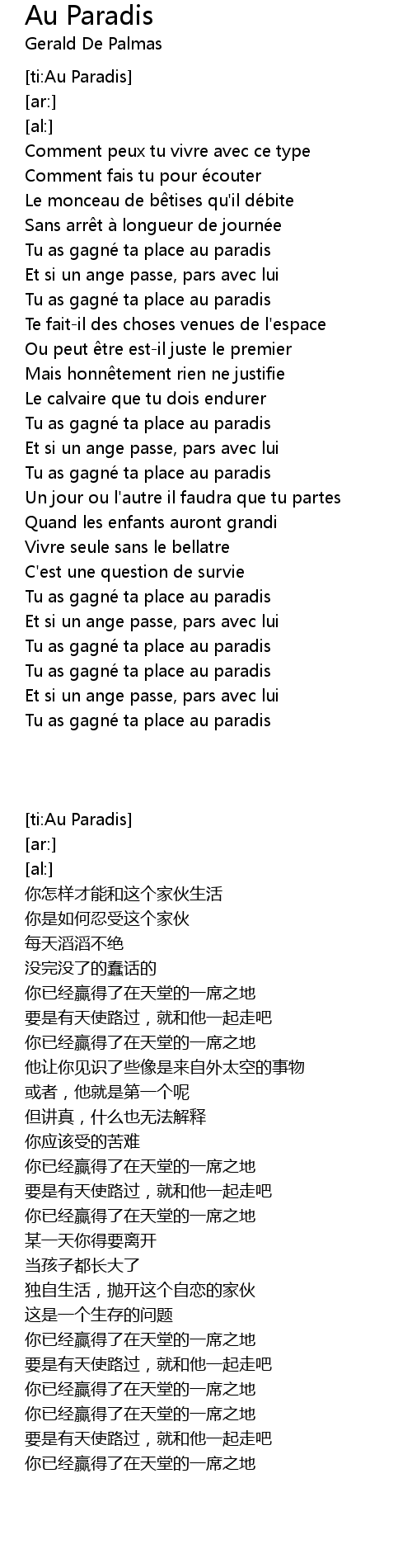 | [00:41.95] | Tu as gagne ta place au paradis |