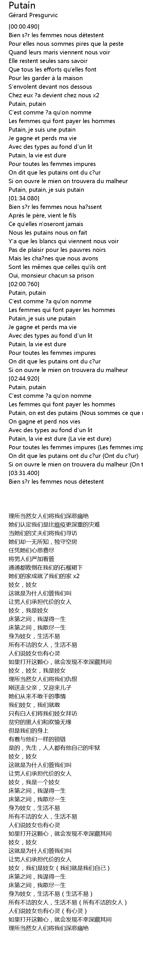 | [03:17.950] | On dit que les putains ont du c? ur Ont du c? ur |